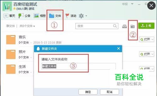 1、进入QQ群之后点击标识①的文件 2、再点击标识②的图标创建文件夹 3、在标识③中输入要创建的文件夹名称
