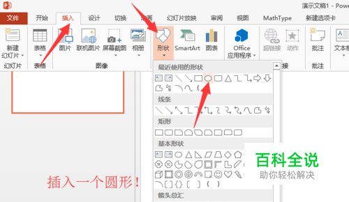打开一个PPT文件,小编使用的是office2013.打开-【开始】-【插入】-【形状】-【椭圆形状】,按住【shift】拖动鼠标,就是个圆形,不然就是一个椭圆咯。