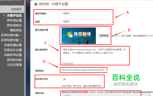 设置官网关键词等基本信息,在A区设置触发官网的关键词及标题,在B处上传触发官网 时回复的图片封面,在C区填入官网回复图文消息的简介,在D处为微官网的唯一性外链地址,E处为设置粉丝在首次关注时是否以微官网作为回复内容,F区代码 PC端网页跳转至微官网代码,这样粉丝在手机端浏览用户PC端网站时可以自然跳转到微信端微官网。最后点击G进行保存。