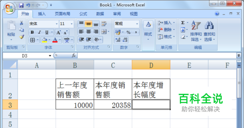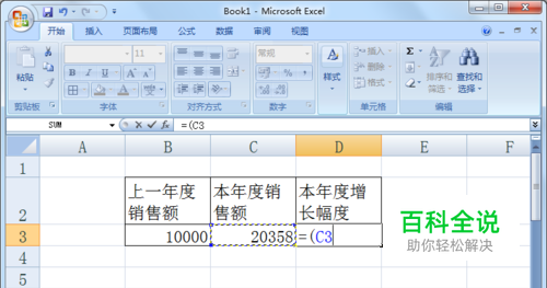 在“本年度增长幅度”下方的单元格中,保持输入法为英文状态,依次输入“=”等号、“(”左括号,然后单击“本年度销售额”下方的单元格。
