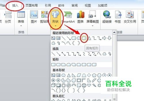 打开word,新建空白文档,点击菜单【插入】,切换到面板后,单击选择【形状】,在下拉菜单中选择 圆角矩形 。