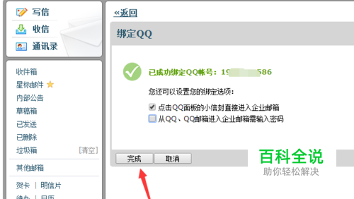 系统提示已成功绑定,然后显示两个选项,1是是否直接通过小信封直接进入,2是是否需要输入企业邮箱密码。根据使用习惯来设置。然后点击完成。