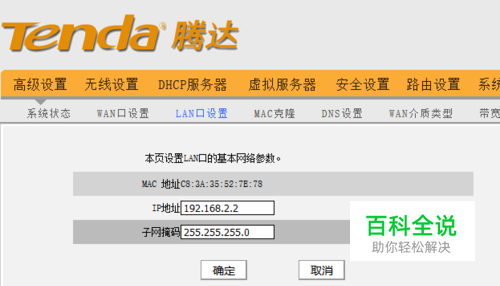 正菜一:更改LAN端口地址 进入高级设置内的LAN端口设置,修改LAN口地址为主路由器分配的地址,掩码地址为255.255.255.0 该例中副路由器地址设置为192.168.2.2 更改后点确定,路由器可能会重启。