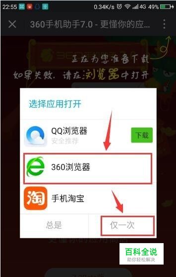 开机手机里的微信,找到“扫一扫”功能,扫描电脑屏幕上的二维码。之后,手机会自动跳转到手机上的360手机助手的主页面。此时,我们只要点击主页面上,最新版本的按钮,就会转到让我们选择下载该APP的应用平台。在这里,建议选择手机里面已经安装好的平台,并选择“仅一次”。再新弹出的页面上,直接点击“确定”按钮。此时,手机就会自动下载并安装。