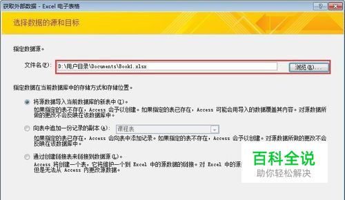 打开数据库后,单击“外部数据”选项卡下“导入”组中的Excel按钮,弹出“获取外部数据-Excel电子表格”对话框。