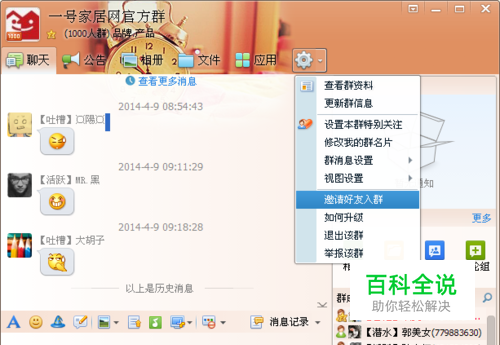 点右上角群设置,下拉菜单中选择邀请好友入群。