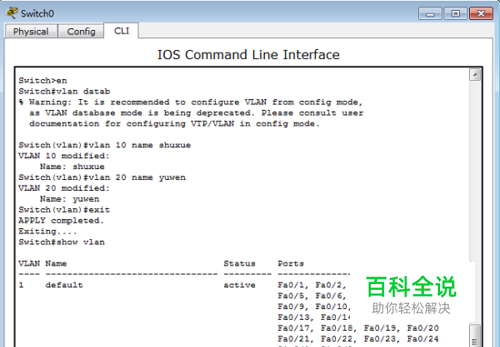在交换机里,创建Vlan。 Switch>en 用户到特权 >enable Switch#vlan datab 设置vlan的数据库 Switch(vlan)#vlan 10 name shuxue 设置了一个名字叫shuxue 的vlan10 Switch(vlan)#vlan 20 name yuwen Switch(vlan)#exit 退出 Switch#show vlan 查看交换机的VLAN