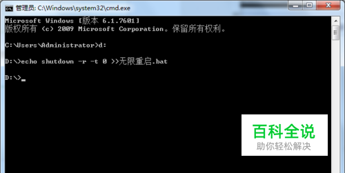 然后进入cmd 输入 del d:\无限重启.bat 来删除无限重启的.bat文件。因为已经有无限重启的.exe文件了。
