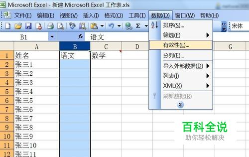 我们对 B列,也就是语文成绩的单元格列进行设置,先选中B列,点击“数据”菜单,找到“有效性”,如下图;