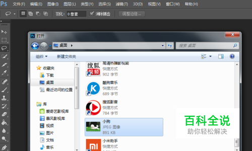 第一步,双击打开ps软件,左上角文件-打开-桌面,我们打开小狗的图片,点击。