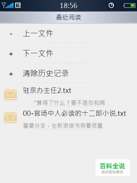 最近打开:点击列出阅读历史记录,点击“上一文件”打开文件夹中上一个文件;点击“下一文件”打开文件夹中下一个文件;点击上方的”清除历史记录“可清除历史记录,但是不删除相应的文件。点击相应历史纪录可打开相应文件。