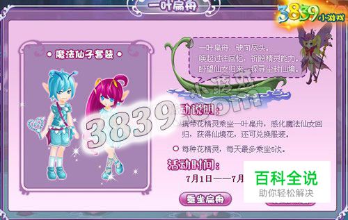 携带花精灵乘坐一叶扁舟,感化魔法仙女回归,获得仙境花,还可以兑换服装。每种花精灵,每天最多乘坐5次哦!