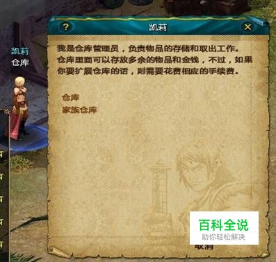 玩家找到相应的仓库NPC,和NPC对话后可以对自己的个人仓库进行操作,如下图所示:
