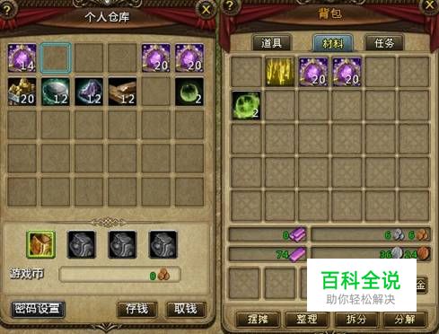 在打开仓库的状态下,玩家直接使用右键点击道具可以把道具放入或取出。如右键点击仓库里的道具,即可取出;右键点击背包的道具,即可存入。