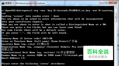 执行成功后提示要输入您的相关信息。填写说明: 1.Country Name: 填您所在国家的ISO标准代号,如中国为CN,美国为US 2.State or Province Name: 填您单位所在地省/自治区/直辖市,如广东省或 Guangdong 3.Locality Name: 填您单位所在地的市/县/区,如佛山市或Foshan 4.Organization Name: 填您单位/机构/企业合法的名称,如广东数字证书认证中心有限公司或Guangdong Certification Authority Co.,Ltd. 5.Organizational Unit Name: 填:部门名称,如技术支持部或Technical support 6.Common Name: 域名,如:testweb.95105813.cn。在多个域名时,填主域名 7.Email Address: 填您的邮件地址,不必输入,按回车跳过 8.‘extra’attributes 从信息开始的都不需要填写,按回车跳过直至命令执行完毕。