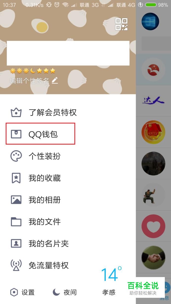 首先,如果想要取消财付通的快捷支付,只要把财付通上绑定的银行卡全部解绑即可。打开手机QQ主页面,点击个人头像,选择“QQ钱包”选项。