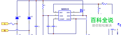 M8919芯片,BUCK架构,非隔离+外置MOS,带有源功率因数校正的高精度降压 型 LED 恒流控制芯片,适用于 85Vac-265Vac 全范 围输入电压的非隔离降压式 LED 恒流电源。M8919 集成有源功率因数校正电路,可以实现很高的功率 因数和很低的总谐波失真。由于工作在电感电流临 界连续模式,功率 MOS 管处于零电流开通状态,开 关损耗得以减小,同时电感的利用率也较高。M8919 采用专利的浮地构架,对电感电流进行全 周期采样,可实现高精度输出恒流控制,并达到优 异的线电压调整率和负载调整率。