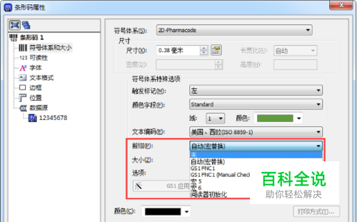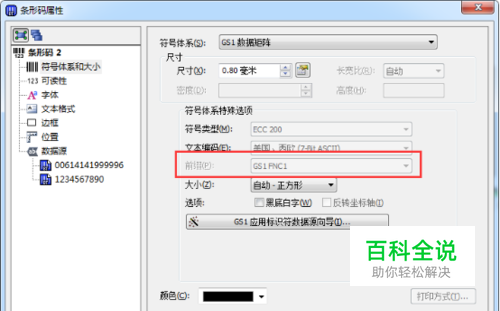 2D-Pharmacode 符号体系和Data Matrix 选择 ECC 200 版本时,都支持以下前缀: •无: 对不含前缀的数据进行编码。 •自动(宏替换): 自动选择相应的宏前缀。 •GS1 FNC1: 符合 AIM International 认可的特定工业标准。 •GS1 FNC1 (Manual Check Digits): 符合含手动选择的检验位的 GS1 标准。 •宏5: 将 05 Macro 头部(前缀)和尾部(后缀)缩写成一个符号字符,以减少对数据进行编码所需的符号字符数。 •宏6: 将 06 Macro 头部(前缀)和尾部(后缀)缩写成一个符号字符,以减少对数据进行编码所需的符号字符数。 •阅读器初始化: 指示符号对用于编写阅读器系统的消息进行编码。 注意:Data Matrix符号体系中,如果您在条形码数据的开头指定了特殊的功能字符(如 FNC1 到 FNC6),并且启用了“前缀”选项,则会忽略在 BarTender 中指定的前缀,以支持数据中的特殊功能字符。