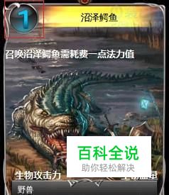 沼泽鳄鱼: 亡灵战士牌堆中所需法力值最少的一张牌,因为只需要消耗1点法力值,因此属性很一般,不过其实这张卡还不错,无论是早期抽到快攻还是后期拿来挡枪或者是直接丢墓地献祭都还可以,因为这个游戏里只耗1点法力值就能召唤的生物实在是太少了。 个人评价:2星半