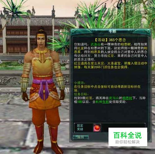 活动时间: 全天 活动NPC: 杭州 牛郎(1309,1075) 参与条件: 玩家等级≥30级