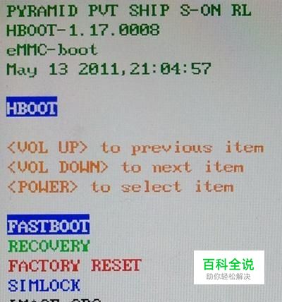 HTC Sensation G14 HBOOT详细介绍 PYRAMID PVT SHIP S-ON RL HBOOT-1.17.0008 eMMC-boot May 13 2011,21:04:57 HBOOT to previous item (音量+键 向上) to next item (音量- 键 向下) to select item (电源 键 确认) FASTBOOT RECOVERY FACTORY RESET SIMLOCK IMAGE CRC