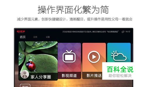 打开电视之后,系统UI一目了然,图标和文字都设计得很大,有利于老人观察, 家人分享圈、影视频道、影视推送、天气预报等四项内容可以满足老人的日常生活和娱乐需要,老人们还可以添加自己喜爱的各种应用。