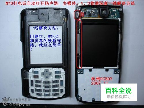 一线解决办法。再次拜读塞班论坛的那篇文章,开始最后的尝试。先从废弃的键盘线上剪下7--8cm(这么长时有道理的),然后剥离出一根铜丝,用火反复灼烧,以去掉铜线表面的绝缘层。再拆机,把准备好的铜线如图固定好。下面是关键:把铜线的一头从A点的小孔穿出,并使之与A点的金属片充分接触(如果先不够长久达不到效果),并且把铜线的末端拧松(这点也很重要),使之能与外面的金属面板也能尽量大面积地接触(铜线表面上一根,其实也是好几根拧在一起的)。一切妥当之后把机装好,盖上金属面板。我多留了个心眼,先用透明胶把金属面粘紧,如果一切正常再正式装。刚装上金属面板时,屏幕亮度不正常,是一种对比度很低的高亮,按压金属面板四周有时可以恢复正常。于是再把面板取下,把铜线的断头弄的蓬松,再装上面板,一切OK,经过2天的使用,再没有出现任何问题,于是放心大胆地用502把金属面板粘牢。到今天快半个月了,一切正常。结果:成功! 总结出来几点:要真正、简单地解决好N70的静电问题有2个办法,1是拆掉金属面板;2是一线搭桥。至于焊接什么的就不是一般人能做得到的了。还有很多机友反映一线法不管用,我想可能有下面几点原因:1用的是电线里面剥离出来的漆包线,没有去掉表面的那层绝缘层,其实用火多烧烧是最好的办法;2金属面板没有很好的与屏幕边框连接,这个可以参考我的办法。