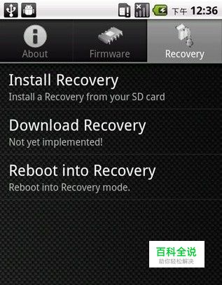 下载此工具刷recovery 1、赋予root权限 2、转至recovery标签页 3、选择Install Recovery后选中要刷入的recovery会跳出这个界面,点ok 没有特别情况的话,上步完成之后就已经为手机输入recovery了。然后就可以点击Reboot into Recovery来进入recovery界面了。(关机后按home(房子建)+音量上+电源键也可以)