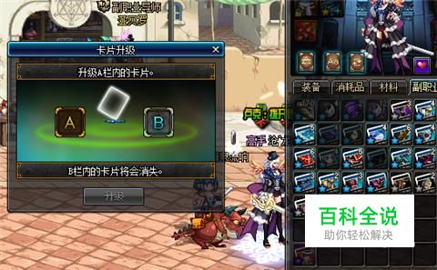 然后将需要升级的卡片放入到A中,拍卖行买的垃圾卡片放入到B中,然后点击升级,然后就祈祷吧,运气好只需要几次就可以升级满级,运气不好要十多次。