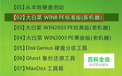 1、将大白菜u盘启动盘插入电脑,重启按快捷键引导u盘进入大白菜主菜单,选择第二项进入win8pe系统。