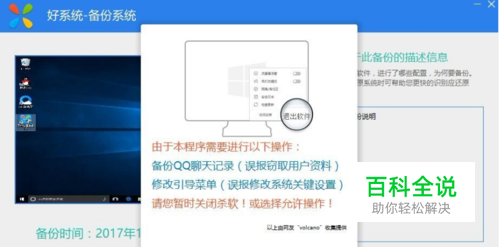 点击开始备份,由于会修改系统引导菜单,在此之前,请关闭杀毒软件,以免备份失败。