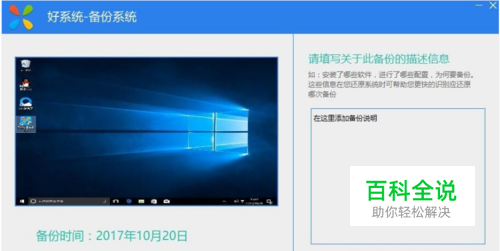 双击打开软件,点击备份,软件会对当前桌面进行自动截图,您可以通过右边的添加备注功能对本次备份做说明。方便以后如果以后有多个备份的话,可以区分辨识。