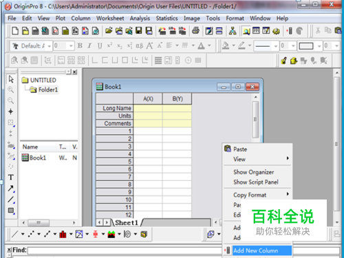 由于三元图是三个坐标,需要增加一列,操作如下:右击B(Y)的空白处,显示下拉菜单(图2),选择Add new column,点击,得到图.