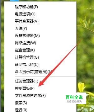 在Windows10桌面下,右键点击开始菜单图标,然后在弹出菜单中选择“控制面板”菜单项