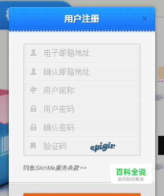 在“用户注册”窗口内填写信息; 在填写完成后单击“ 同意SkinMe服务条款”右边的 开关; 在弹出的窗口右边的进度条拉到最下面,并单击“ 同意”按钮; 最后单击“ 注册”按钮。