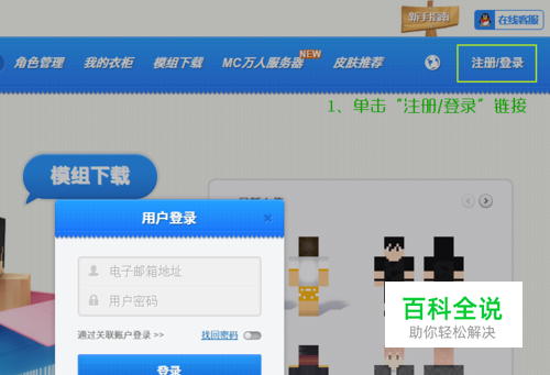 单击右上角的“ 注册/登录”链接; 在弹出的窗口内单击“ 注册”按钮。