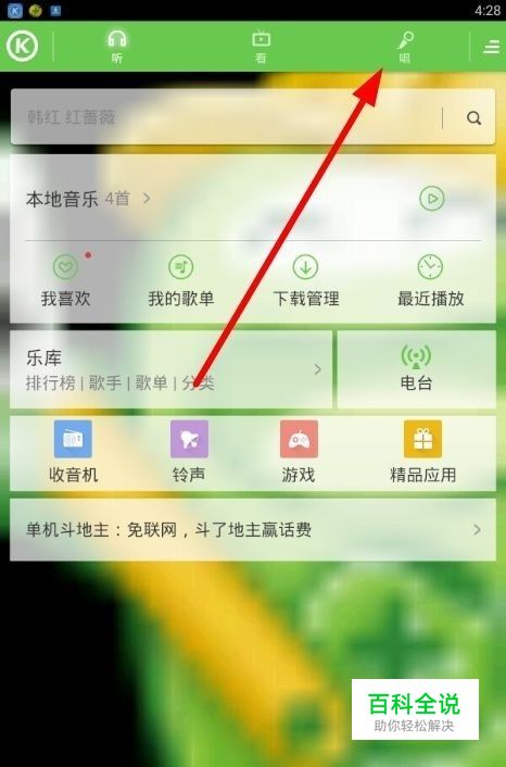 第一步,安装酷狗音乐,点开酷狗音乐,然后点一下图上的唱就行了!