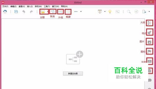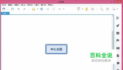 打卡XMind 8 Update 2软件。页面上方为菜单栏,右侧为工具栏,可以对新建主题进行设置。