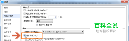 如果想减少wps文档的大小,可勾选【仅嵌入文档中所用的字符】。