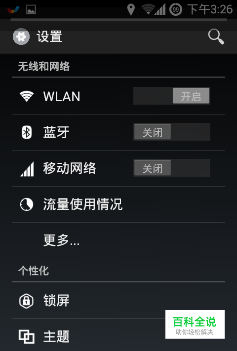 在首屏上选择<设置>菜单,如果之前没有在首页添加快捷方式,就通过<应用程序>再进入<设置>菜单。