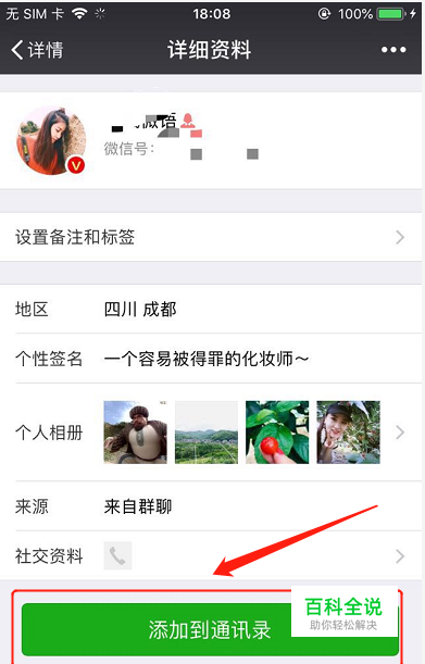 点击对方头像会出现【添加到通讯录】这时候可以直接添加成功,不需要对方确认。