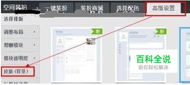 ,然后切换到“高级设置”选项卡,在界面左侧的选项卡列表中点击“皮肤(背景)”,如图所示。