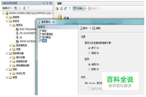 如果还是没解决,可以检查SA 用户是否被打开:第一步:右键SA 用户,打开属性。第二步:选择“状态”选项卡,勾选登陆中的启用。 SA 没有被启用,在数据库刚开始使用的时候很容易出现,刚安装完SQLServer的时候SA 用户默认是关闭的,往往不被人知道。