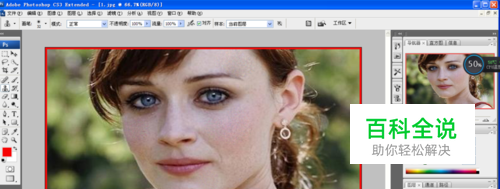 按crl+J键新建图层,选择污点修复画笔工具,对人物脸部的斑点进行去除,这时候发现人物脸部的磨皮效果很不错了哦。