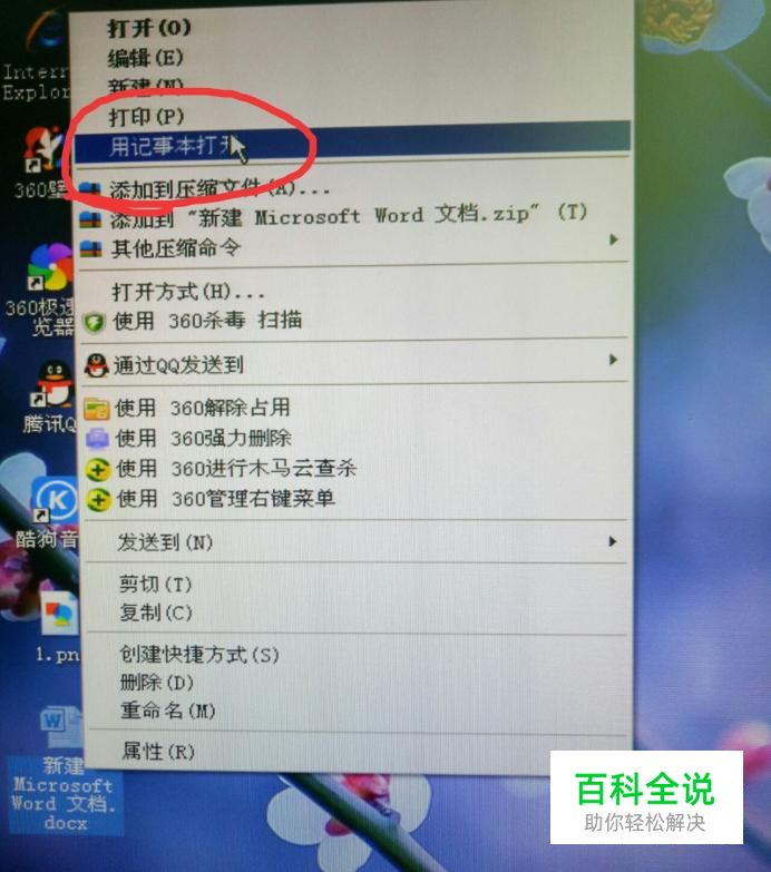 鼠标右键单击doc文件,选择“用记事本打开”。