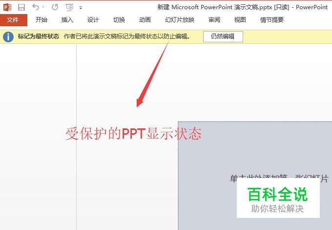首先我们先打开一个受保护的PPT,你可以看到PPT的顶部提示了此文档受保护,在你不做任何操作的时候是不能编辑文档的,如下图所示