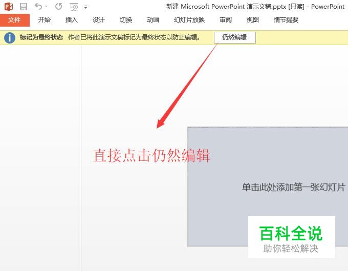 最后回到PPT的界面中,如果上面的提示没有了的话则证明可以对PPT进行编辑了
