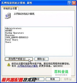 第2步,在打开的“从网络访问此计算机 属性”对话框中单击“添加用户或组”按钮,如图2008112626所示。 图2008112626 单击“添加用户或组”按钮