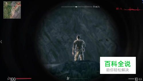 接下来是开镜瞄准后的界面。上方的白条是风速,中近距离不用太在意,子弹不会受风的太大影响。远距离的话尽量等风小一点再射击,要对着与白条相反的地方瞄准才可以。按下shift可以屏住呼吸并且进入子弹时间,敌人的边框成白色,也有特殊音效,可以稳定瞄准,不过子弹依然受风速影响。 右上角的是心跳,刚跑步后立刻瞄准会发现心跳很快,瞄准很不稳,来回晃动很厉害,并且不能屏气,这种时候等一下就好,原地休息下等心跳慢下来。