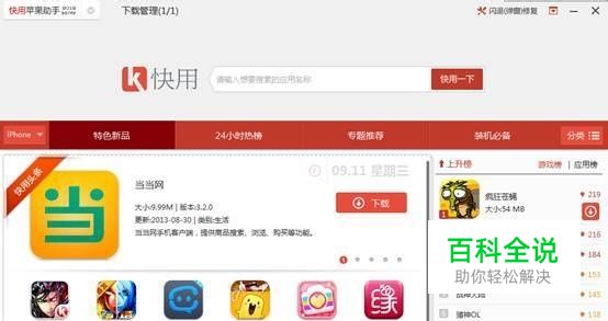 在刚刚结束的苹果发布会上,除了发布了iPhone5s/5c外,iOS 7GM版(相当于正式版)也亮相其中。发布会吸引了全世界的目光,大家终于见到了iOS 7正式版的庐山真面目,想必大家也已经把自己的设备升级到iOS 7了。新系统在备受瞩目的同时,也带来了新的问题,要怎么才能免费下载游戏呢?毕竟系统短时间内还不能越狱。其实,快用苹果助手已经解决了这一问题,完美支持最新的iOS 7系统,可以在不越狱的情况下免费进行下载。今天,我就来教大家如何使用快用苹果助手进行下载。首先,进入快用苹果助手的官网http://www.kuaiyong.com/,下载快用苹果助手 第二步,打开快用苹果助手,并把你的设备连接到电脑 第三步,在搜索栏中搜索你想要的应用,如水果忍者 第四步,点击想要下载的游戏图标,进入应用页面 第五步,点击下载按钮,进入下载页面,等待下载完成后自动安装即可